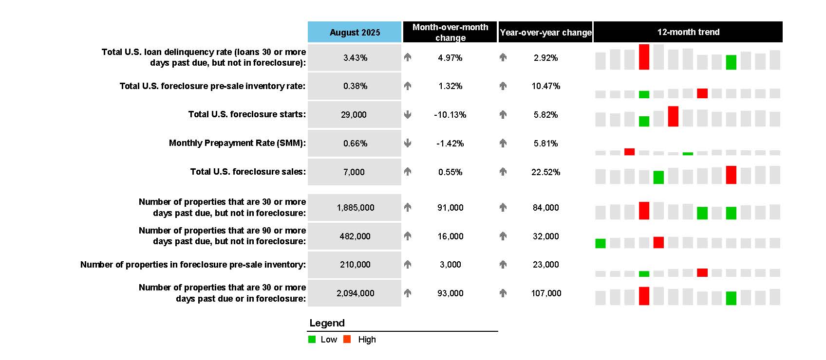 Serious delinquencies (loans 90+ days past due but not in foreclosure) rose by 16,000 in August and are up 32,000 year over year, while loans in active foreclosure increased by 3,000 for the month and 23,000 since last year.