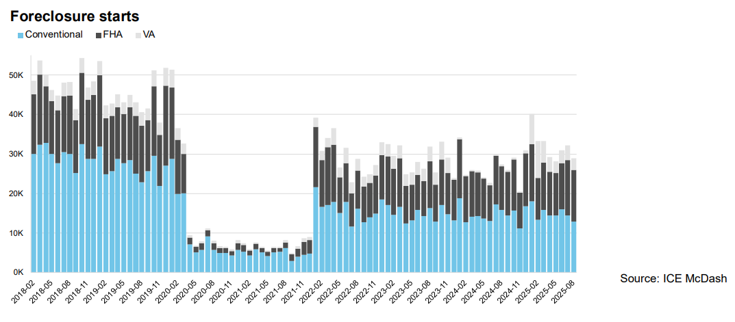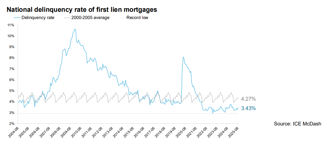 Mortgage delinquencies typically face little seasonal pressure from July to August, but the last day of August 2025 falling on a Sunday resulted in delayed processing and temporarily higher delinquency rolls. For instance, August 2003, 2008, and 2014 also ended on a Sunday, each experiencing a delinquency rise averaging 5.3%. This is similar to the 5.0% rise observed this year – suggesting that much of August’s delinquency rise may have been driven by the way the calendar fell.